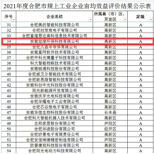 世綠環(huán)保在合肥市畝均效益中被評(píng)為A類企業(yè)